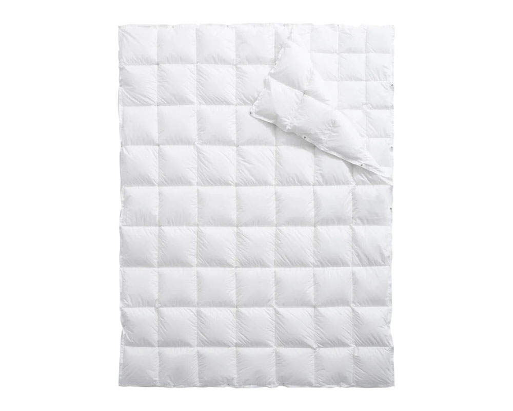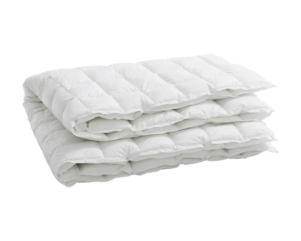 Le duvet double INTERLAKEN garantit une température agréable tout au long de l’année pendant votre sommeil. Cette couverture se compose de 2 duvets indépendants, ayant chacun un degré de rétention de chaleur qui lui est propre. Le duvet le plus léger est idéal pour les douces nuits d’été, tandis que le plus épais est indiqué pour le printemps et l’automne. Quand arrive le froid de l’hiver, il suffit de boutonner les deux ensemble pour profiter d’un lit douillet et bien chaud. La couverture est garnie de duvet de grande qualité, issu d’élevages respectueux du bien-être de leurs oies.