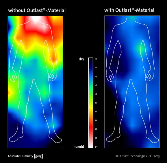 Les fibres Outlast avec PCM absorbent la chaleur excédentaire, l'accumulent et la libèrent à nouveau si nécessaire. Ce système présente le grand avantage de réduire sensiblement la transpiration et de réaliser une compensation active et dynamique des variations de température. Résultat : le lit reste plus sec et le dormeur profite d'un sommeil plus détendu.