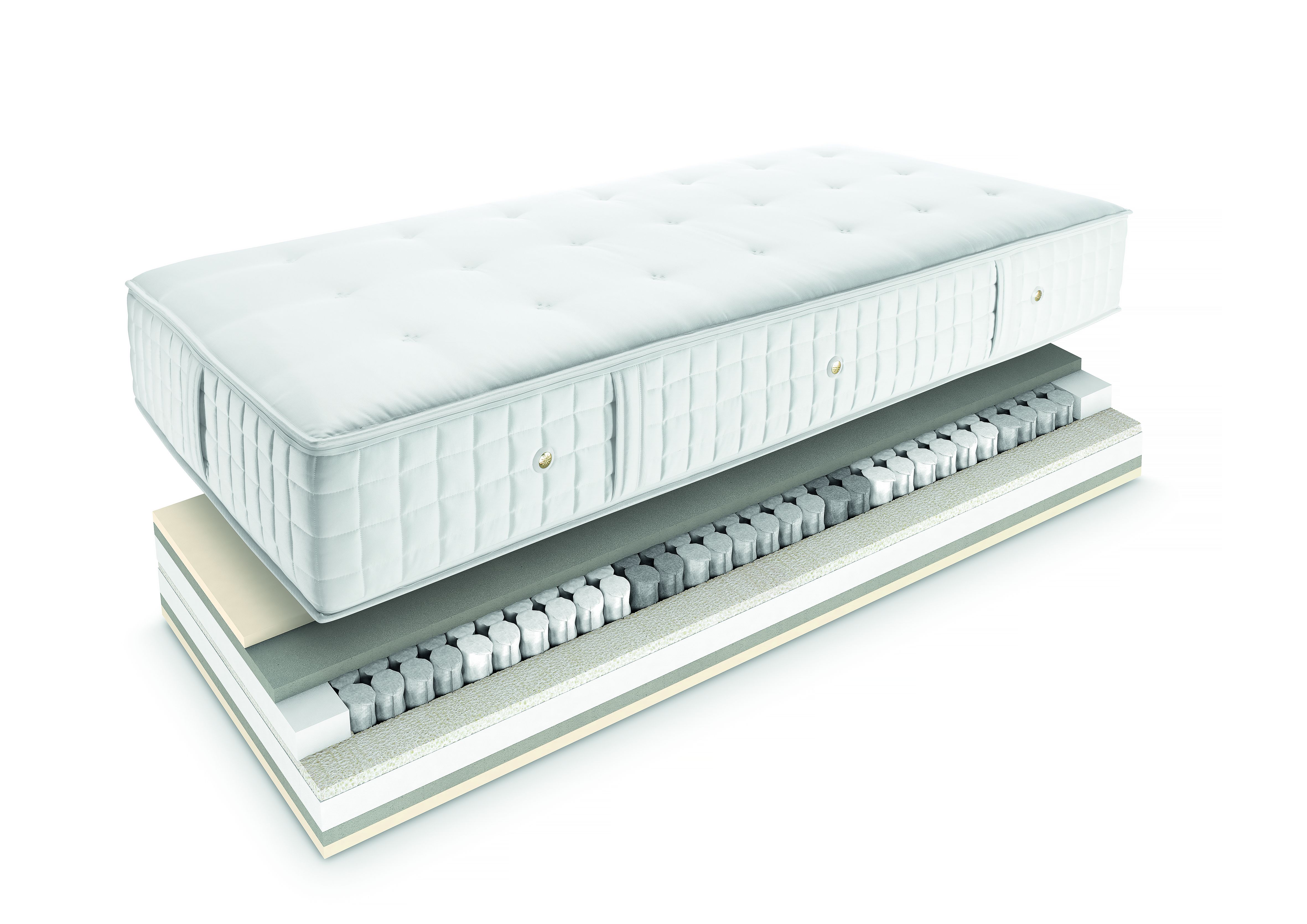 Noyau : ressorts ensachés VESPA, 7 zones de confort de 14 cm, latex naturel perforé, bord renforcé en mousse HR. Zones de confort pour épaules, bassin et soutien des lombaires.